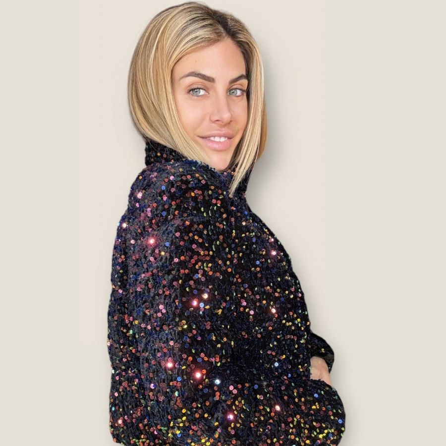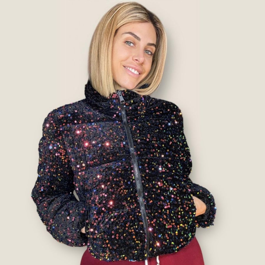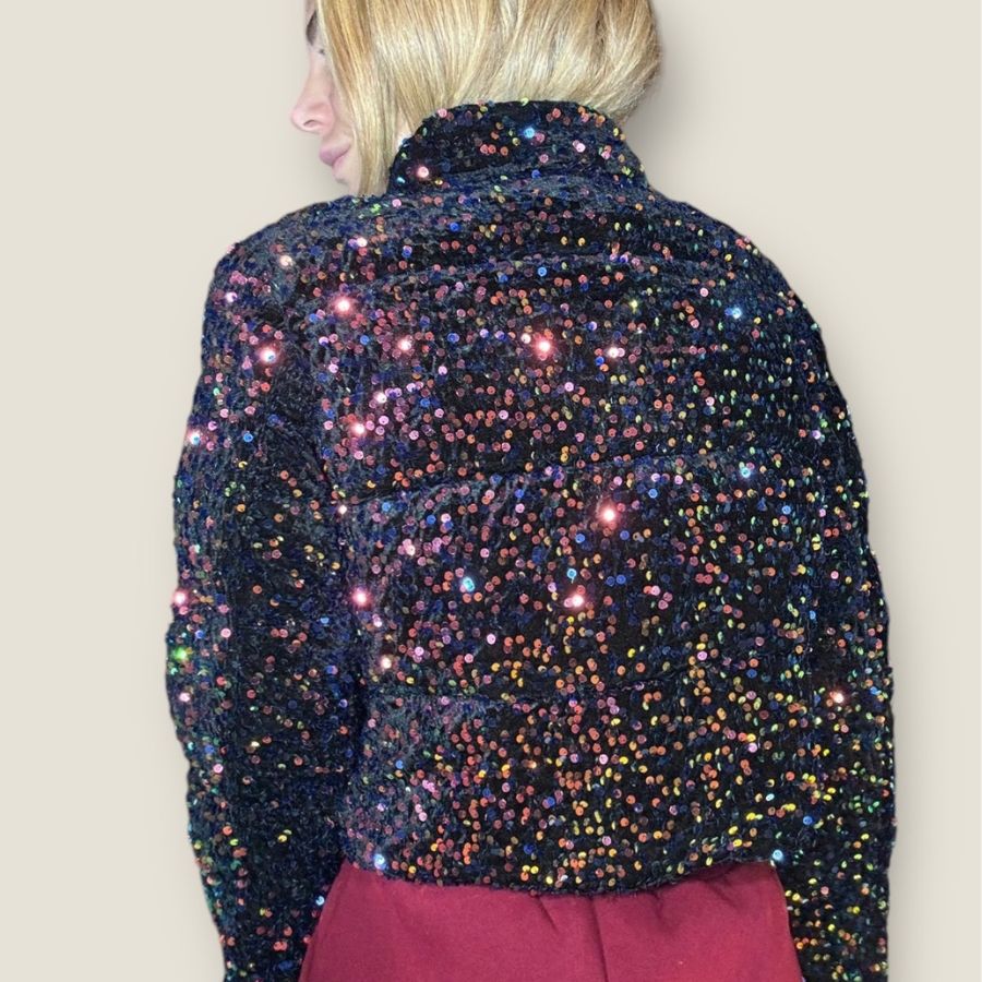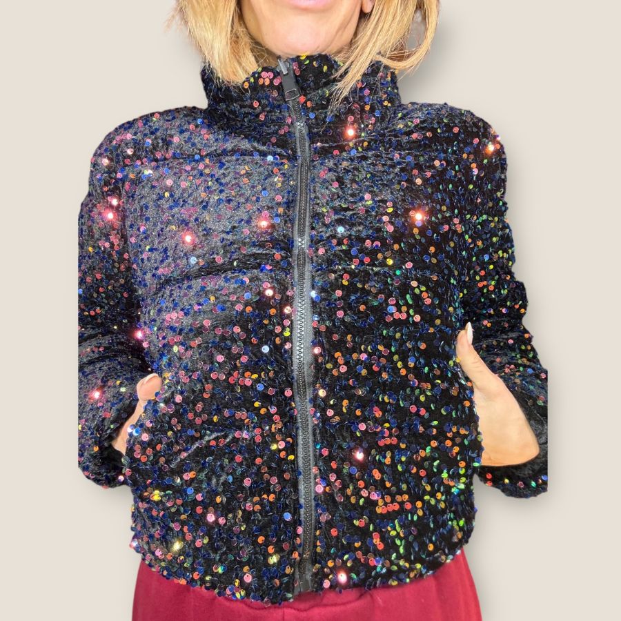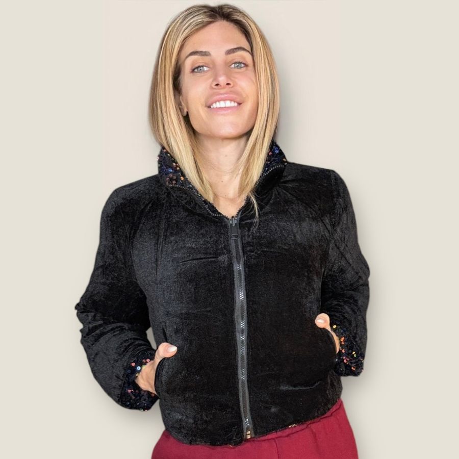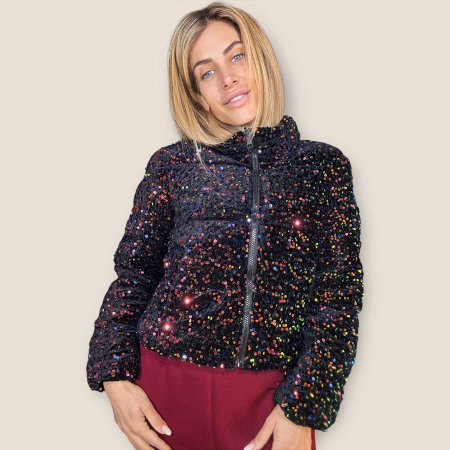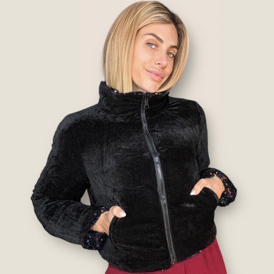 Piumino corto double face con collo alto e base velluto tempestato di paillettes